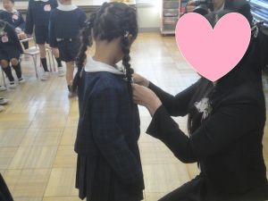 担任の先生に、胸につけてもらいます。みんなのお顔もとっても凛々しく見えました。