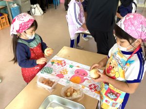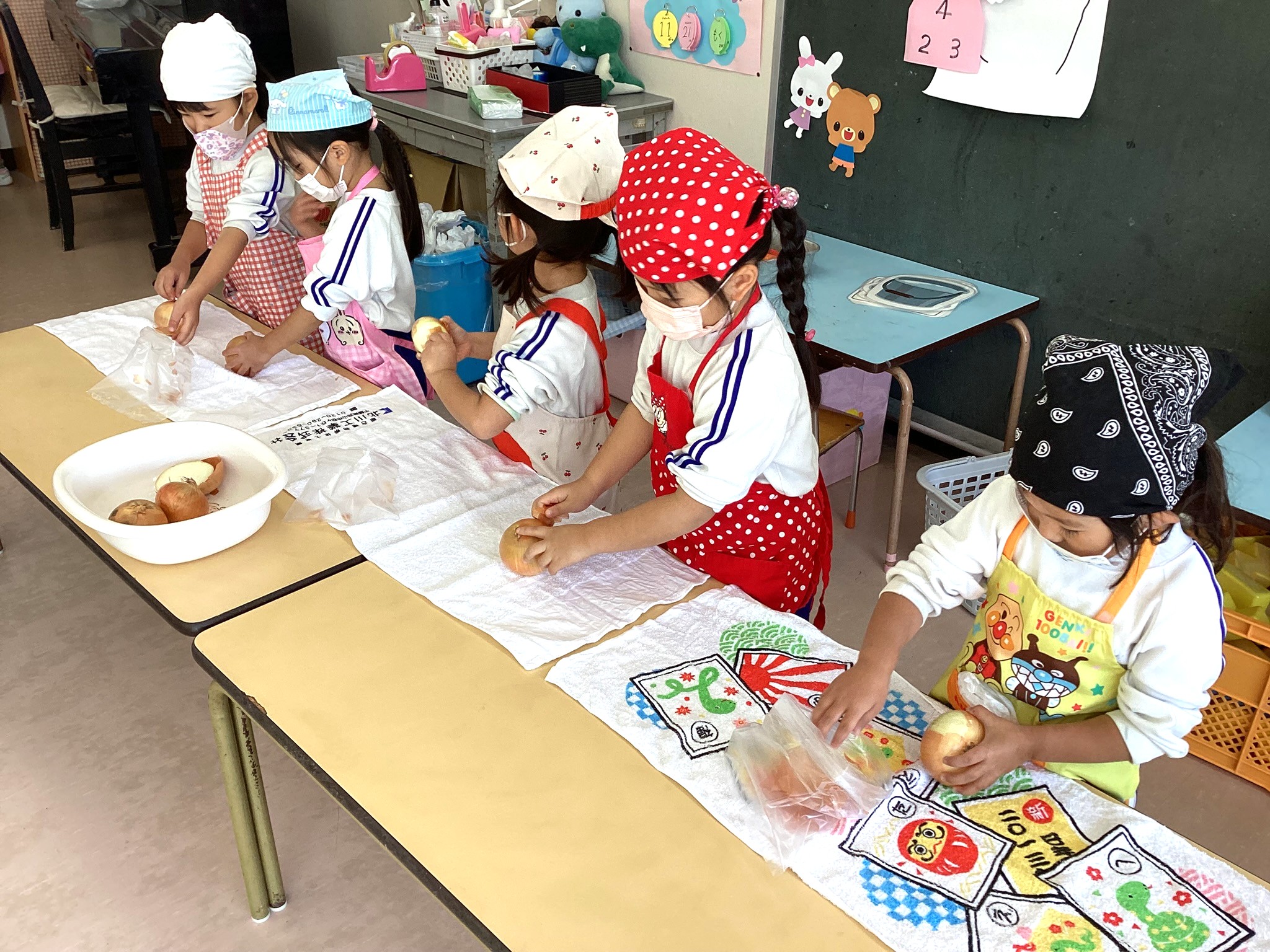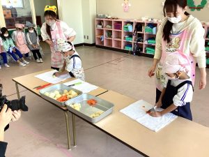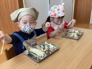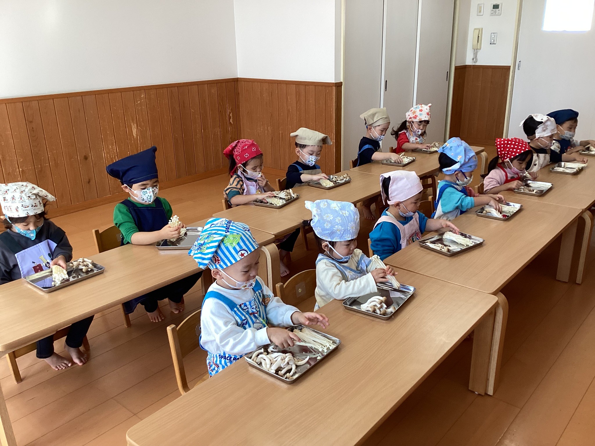 711月27日、保育園児が食育として、しめじとえのきのきのこちぎりを行いました。