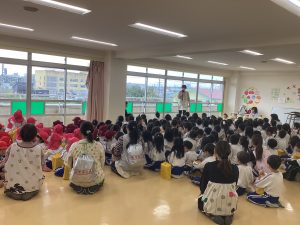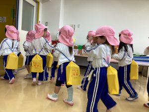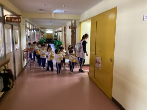 10月24日(金)13時の「新方川の氾濫危険度が警戒になりました。先生のお話を聞いて3階のプレイルームのお部屋に避難して下さい」の放送を合図に避難訓練を行いました。
