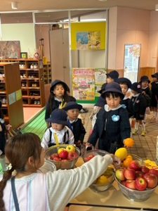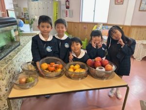 お家から果物を持ちより、朝の玄関はまるで果物屋さんのよう❗