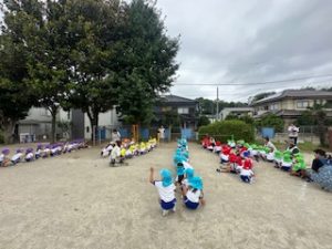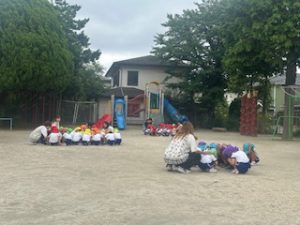 まずは、外遊びをしている時に地震が起きた事を想定して、園庭で避難します。