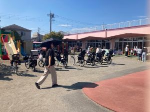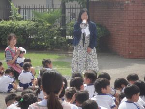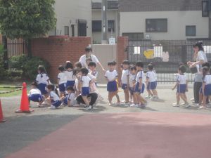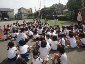 園長先生は、「今日は園庭に集まりましたが、園庭も危ない場合は、商店街の方へ逃げなければならないこともあります」とお話しして下さいました。