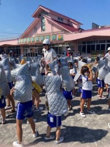 子どもたちも、回を重ねるごとに防災頭巾を上手にかぶれるようになっています。