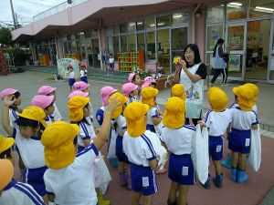 年長さんの出発式では、園長先生が川越のマスコットキャラ「ときも」をつれてきてくれましたよ!