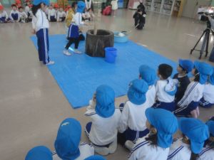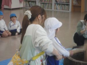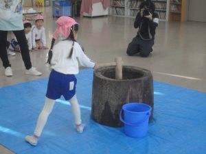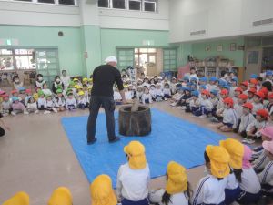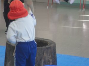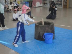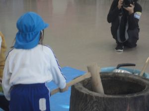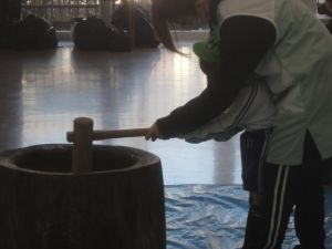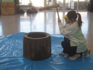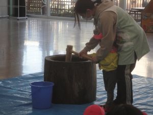 最初に、園長先生が大きな杵でつきました。次にバスの荻原さんががもち米をこねて、さらにつきやすくして下さいました。