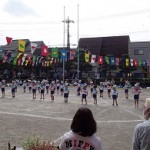 まずは年長さんの鼓笛によるオープニングセレモニーのあと、開会式です。今年の準備体操はたけのこ体操でしたよ。