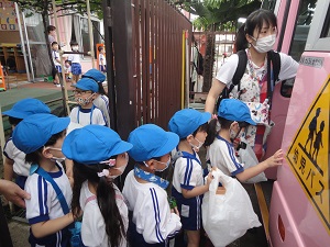 実はね・・いつも歩いて幼稚園に来ているお友だちは、今日園バスに乗れるのをとっても楽しみにしていましたよ。