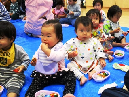 あいにくの雨模様でしたが、園内でそろって弁当給食をいただきました。