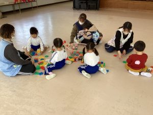 1月27日、パンダクラブの子と満3歳りす組の子が一緒に遊びました。4月からも仲よく遊ぼうね!