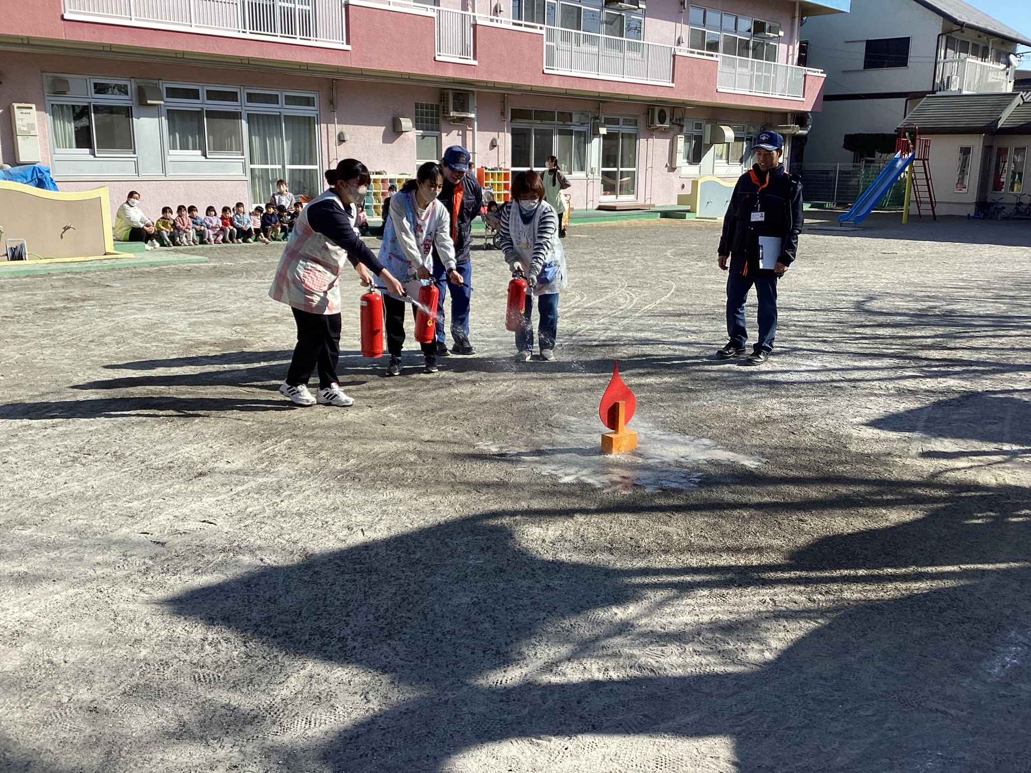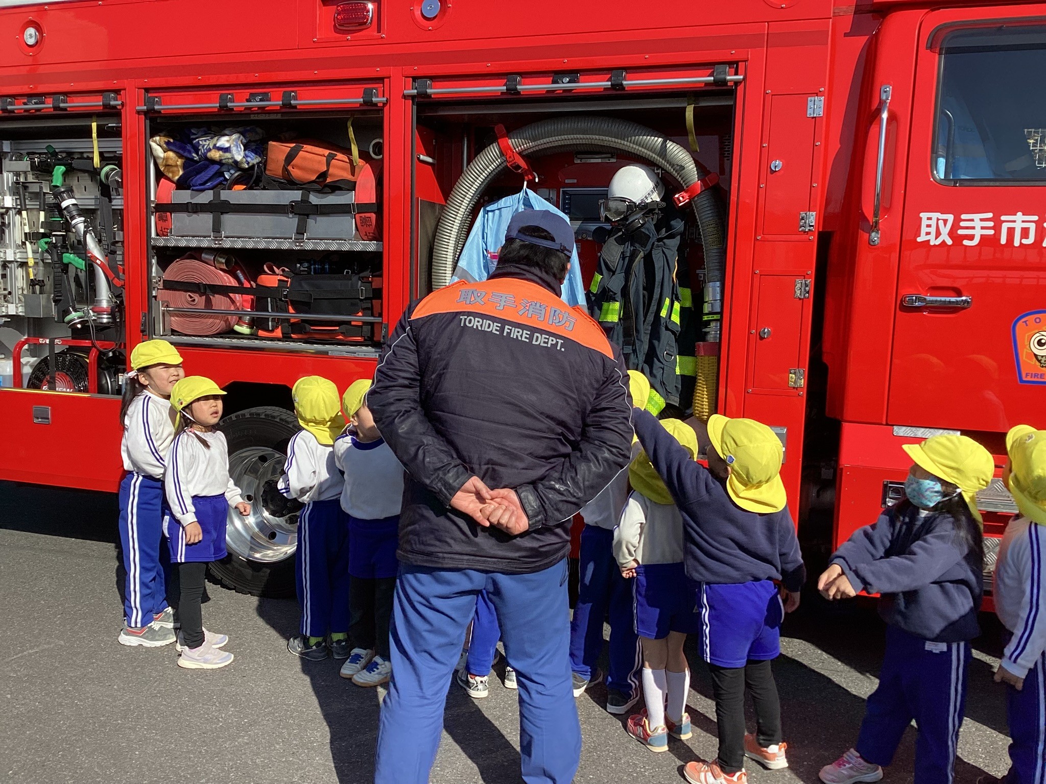1月30日、消防署の方に来ていただき、避難訓練、消火訓練を行いました。その後、消防車も見せていただきました。